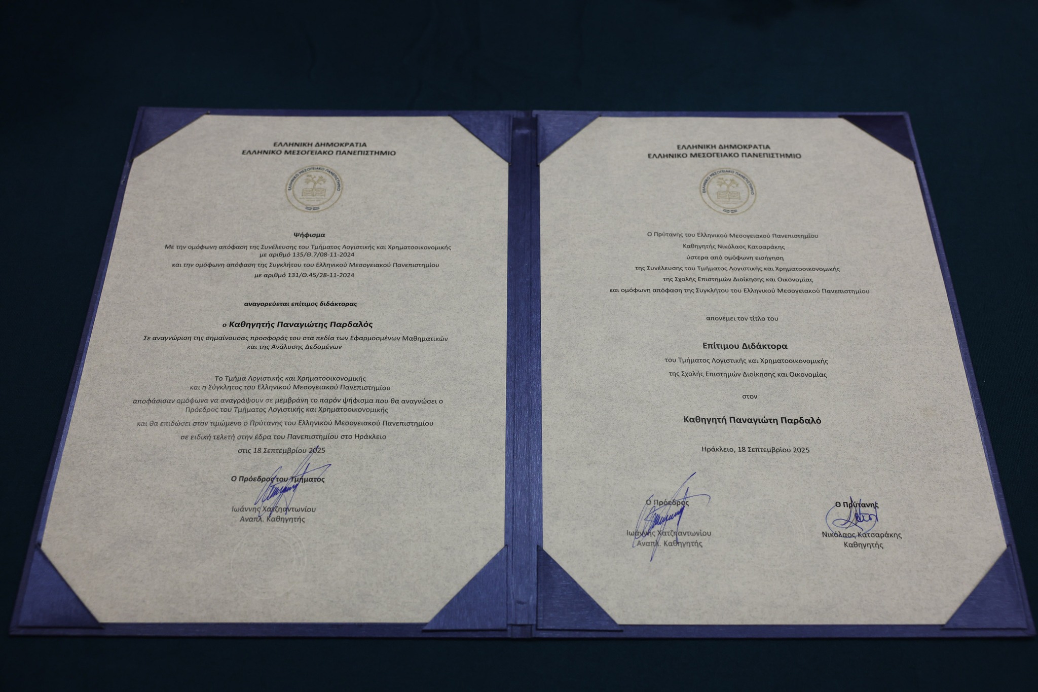 Με ιδιαίτερη επισημότητα πραγματοποιήθηκε την Πέμπτη 18 Σεπτεμβρίου 2025, στο Αμφιθέατρο Εκδηλώσεων της Σχολής Επιστημών Υγείας του Ελληνικού Μεσογειακού Πανεπιστημίου (ΕΛΜΕΠΑ), η τελετή αναγόρευσης του διεθνούς φήμης Καθηγητή Παναγιώτη (Πάνου) Παρδαλού σε Επίτιμο Διδάκτορα του Τμήματος Λογιστικής και Χρηματοοικονομικής (https://accfin.hmu.gr/) της Σχολής Επιστημών Διοίκησης και Οικονομίας.
