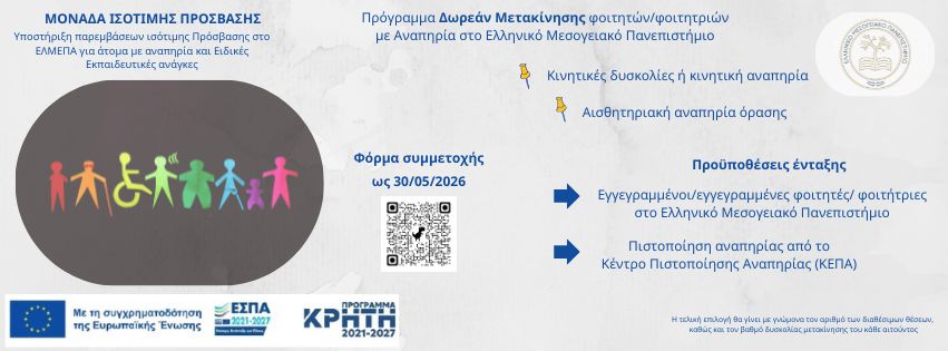 Η Μονάδα Ισότιμης Πρόσβασης του Ελληνικού Μεσογειακού Πανεπιστημίου προσκαλεί τους/τις φοιτητές/φοιτήτριες με αναπηρία, να δηλώσουν συμμετοχή στη δράση δωρεάν μετακίνησης από και προς τους χώρους του Πανεπιστημίου.